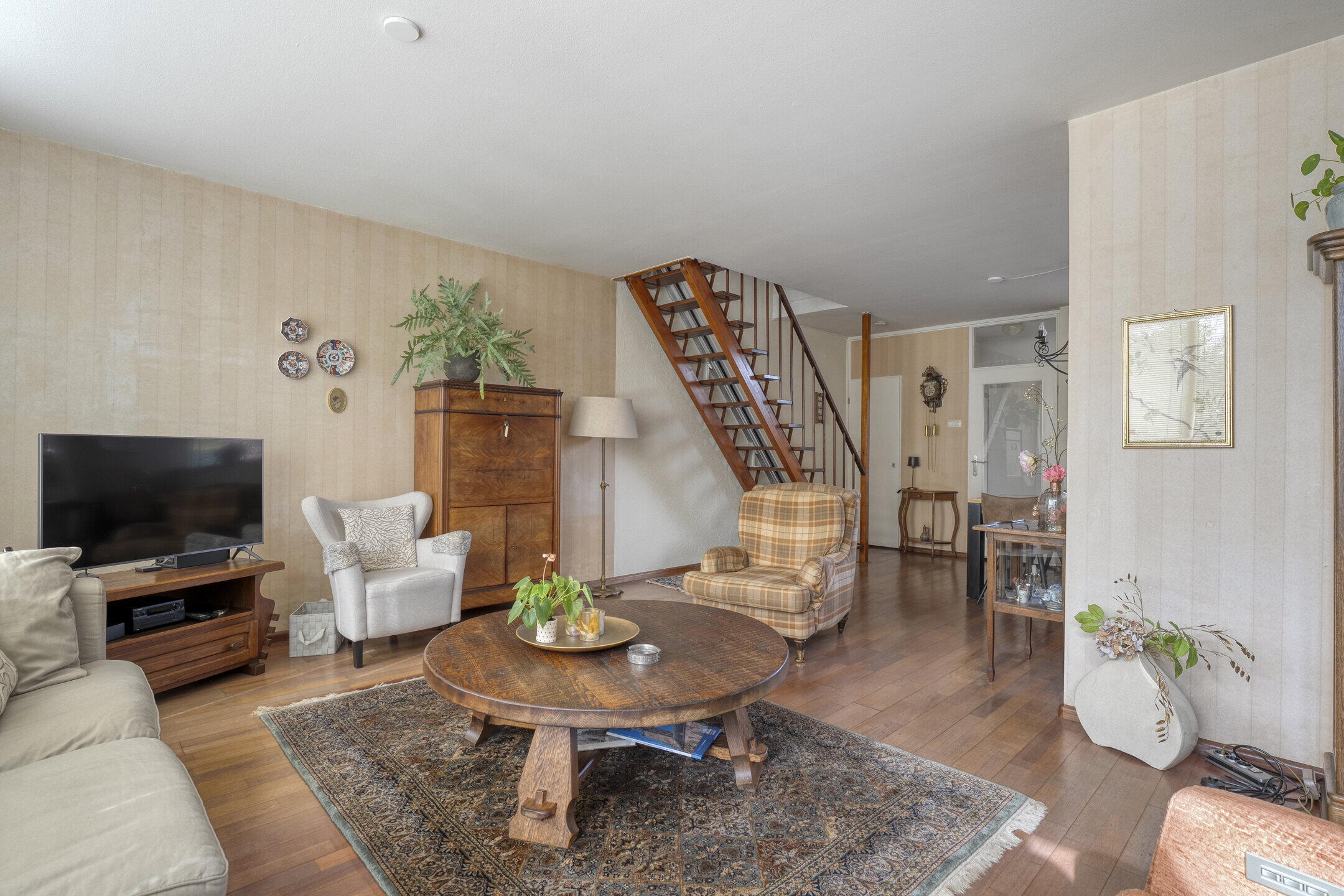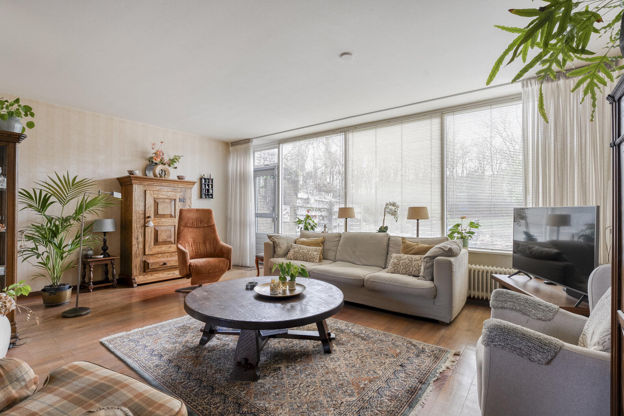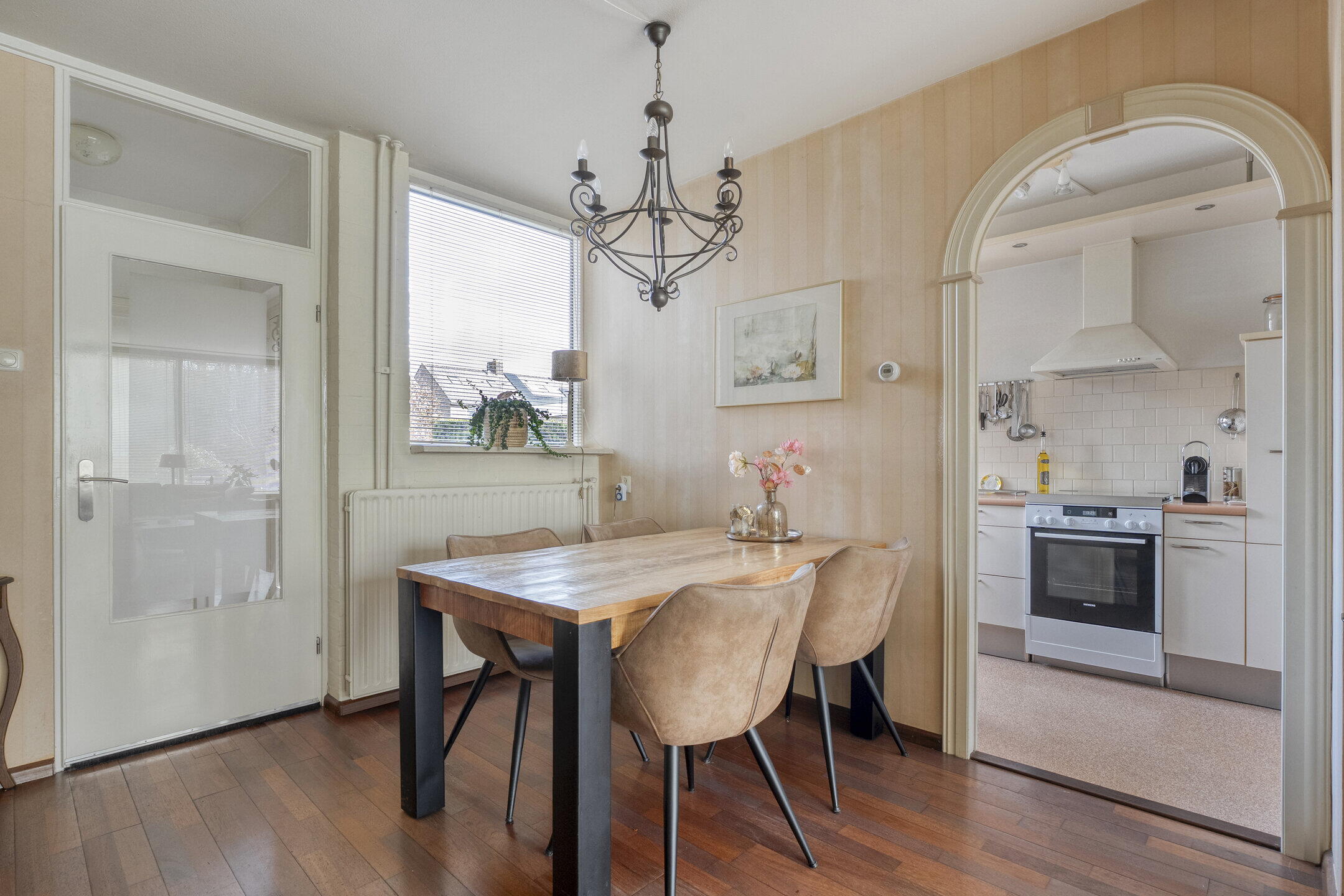 De royale leefruimte met houten vloer bestaat uit een tuingerichte woonkamer en een dichte, praktische keuken.